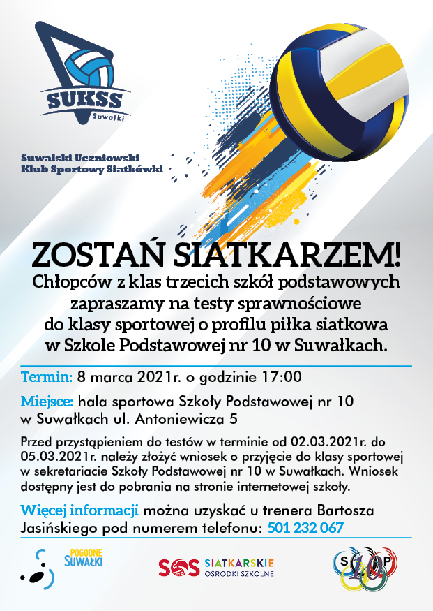 Suwalski Uczniowski Klub Sportowy Siatkówki oraz Szkoła Podstawowa nr 10 w Suwałkach serdecznie zapraszają chłopców z klas trzecich szkół podstawowych na testy sprawnościowe do klasy sportowej o profilu piłka siatkowa.