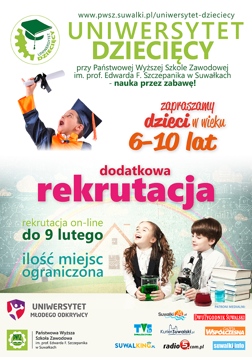 Państwowa Wyższa Szkoła Zawodowa w Suwałkach otrzymała 40 tysięcy złotych dofinansowania do projektu "UMO-wieni na odkrywanie PWSZ", który znalazł się wśród 65 najlepszych. Dzięki dodatkowym środkom zajęcia na Uniwersytecie Dziecięcym będą trwały dłużej, bo aż do czerwca 2017 roku). Dodatkowa rekrutacja on-line potrwa do 9. lutego, a ilość miejsc jest ograniczona