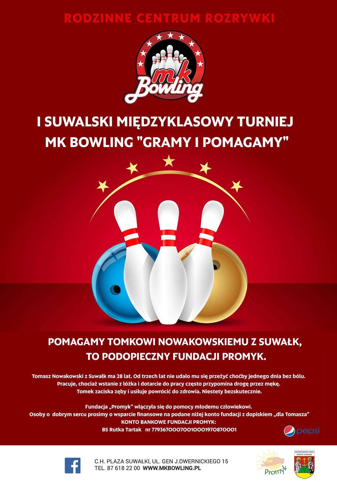- Każdy uczestnik może przeznaczyć symboliczną złotówkę na leczenie i rehabilitację Tomka Nowakowskiego, podopiecznego fundacji Promyk – mówi Piotr Staszkiewicz, wiceprzewodniczący Młodzieżowej Rady Miasta Suwałki, która organizuje ligę wespół z Rodzinnym Centrum Rozrywki MK Bowling. - Turniej bedzie odbywał się przez dwa tygodnie od następnego poniedziałku (16 stycznia w godzinach od 8.00 do 10.00). Każda klasa wybierze dzień, w którym przyjdzie do kregielnie i zdobędzie dany wynik. Następnie, najprawdopodobniej 30 stycznia, zagramy Final Four, czyli półfinały i finały z drużynami które osiągną cztery najlepsze rezultaty w fazie eliminacji.