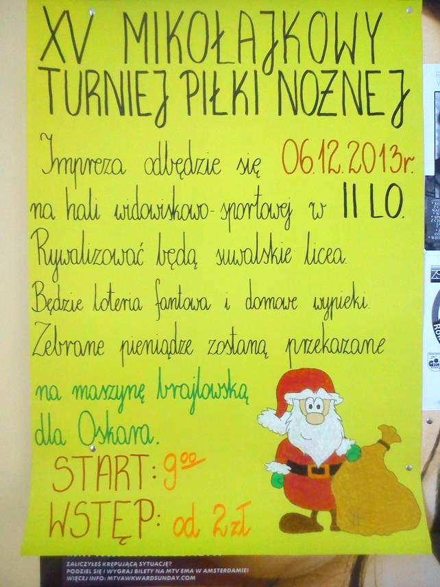 Z okazji Mikołajek w II LO w Suwałkach odbył się Mikołajkowy Turniej Piłki Nożnej. W meczach wzięli udział uczniowie z czterech suwalskich szkół ponadgimnazjalnych: I, II, III oraz IV Liceum Ogólnokształcącego. Turniej ten nie odbył się bez przyczyny. Jest to już jego XV edycja, którą organizuje II LO.