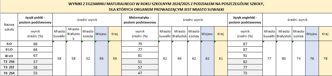 W Suwałkach maturę w tym roku zdawało 775 uczniów szkół. Jak wynika z danych Okręgowej Komisji Egzaminacyjnej w Łomży, najwyższy wynik z języka polskiego uzyskali uczniowie I Liceum Ogólnokształcącego z Oddziałami Dwujęzycznymi im. M. Konopnickiej – 68%. Najwyższy średni wynik z matematyki uzyskali uczniowie III Liceum Ogólnokształcącego z Oddziałami Dwujęzycznymi im. A. Lityńskiego – 81%. Także z językiem angielskim najlepiej poradzili sobie absolwenci III LO, uzyskując średnią na poziomie 91%.