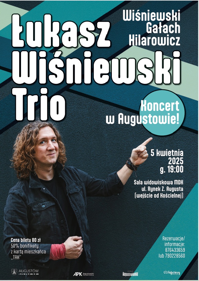 Augustowskie Placówki Kultury serdecznie zapraszają na kolejne muzyczne wydarzenie – na scenie Miejskiego Domu Kultury (Rynek Zygmunta Augusta 9, sala widowiskowa – wejście od ul. Kościelnej, II piętro) w sobotę 5 kwietnia 2025 o godz. 19:00 wystąpi formacja Łukasz Wiśniewski Trio.