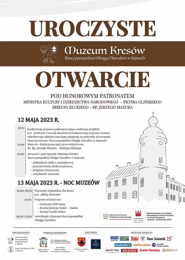 W piątek, 12 maja, odbędzie się uroczyste otwarcie Muzeum Kresów Rzeczpospolitej Obojga Narodów w wyremontowanym klasztorze podominikańskim w Sejnach. Na uroczystości przybędą polscy i litewscy goście. Organizatorem uroczystości będzie Parafia Nawiedzenia NMP w Sejnach. Patronat honorowy nad tym wydarzeniem objęli biskup ełcki Jerzy Mazur i wicepremier, minister Kultury i Dziedzictwa Narodowego Piotr Gliński.