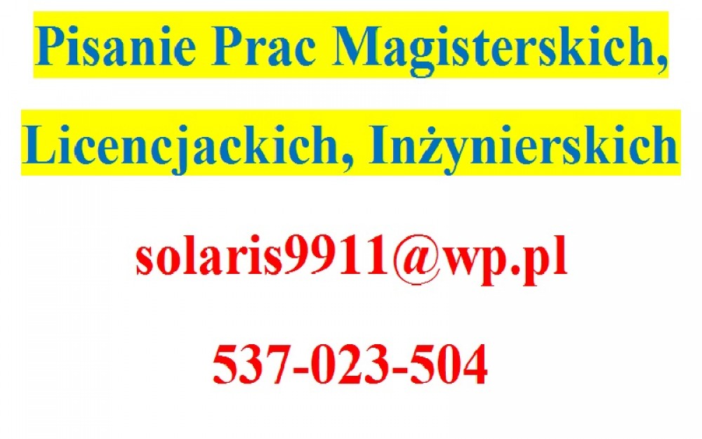 Zapewniam rzetelną i uczciwą pomoc w przygotowaniu prac magisterskich, licencjackich, inżynierskich. Jednocześnie, udzielam wsparcia w opracowaniu prac zaliczeniowych, esejów, referatów.Moja pomoc obejmuje również nanoszenie poprawek do prac dyplomowych.